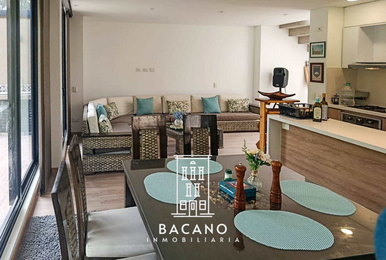 House for rent in Cota with views of the city and hills. Very well located in the El Rozo area. It is close to restaurants and shopping centers. The complex has a communal lounge and terrace, BBQ area, gym, business room, screening room, tennis court, screening room, children's playroom, 24-hour security and visitor parking. Immediate availability.